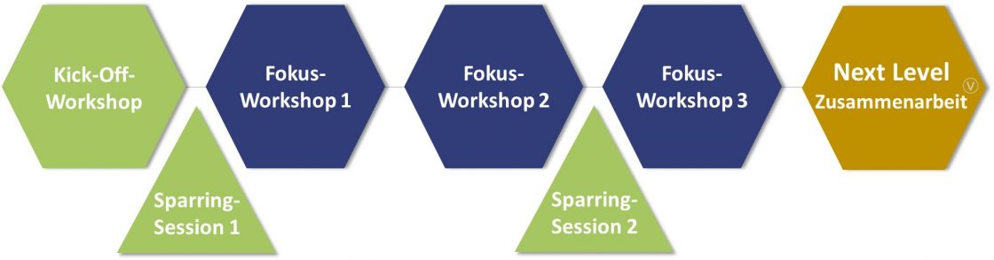 Mit einem starken Kick-off, gezielten Fokus-Workshops und begleitenden Sparring-Sessions entwickeln Sie Ihren eigenen